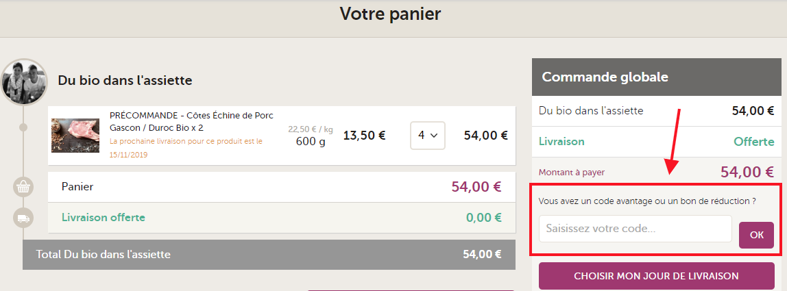 Puis cliquez sur la mention «Vous avez un code avantage ou un bon de réduction ?» qui se trouve dans l'encart "Commande globale" à droite.